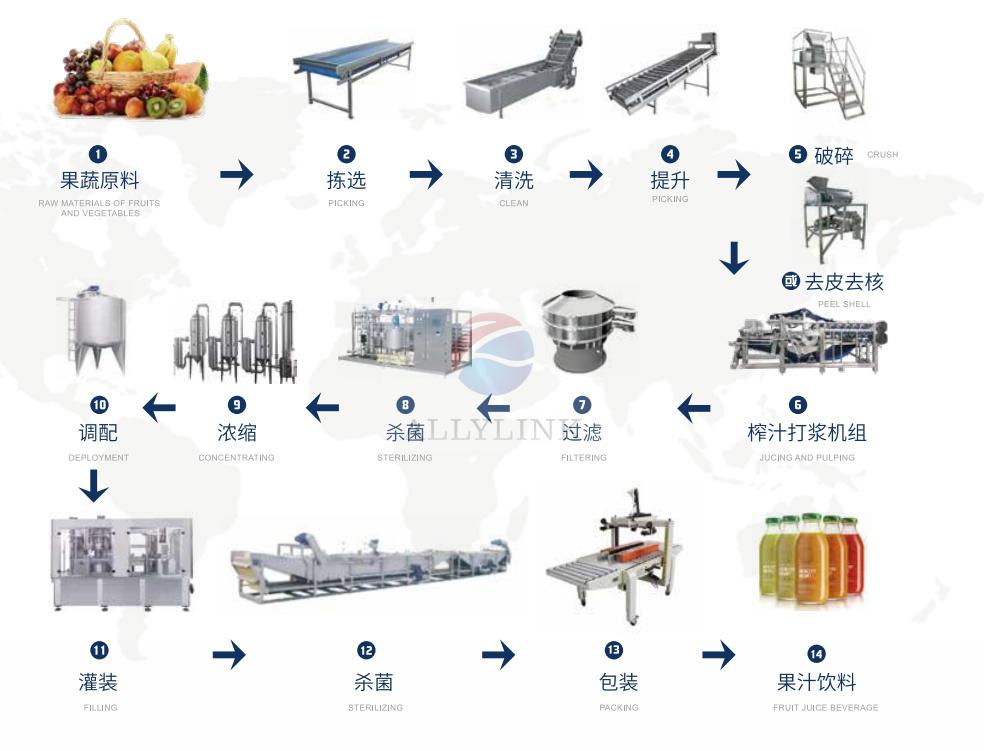 整套水果深加工果汁(zhī)飲料生產線(xiàn)工藝流程: